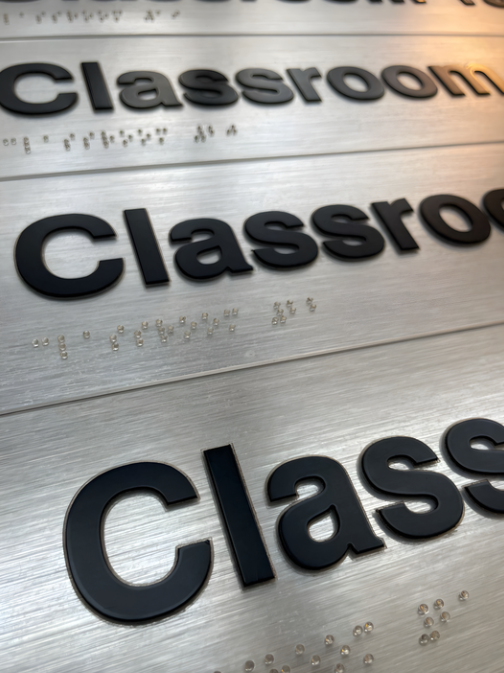 Our team at Alexander Boyd Displays created a range of brushed aluminium signs featuring bold, raised black text with corresponding Braille translations beneath. Each sign was precision-cut and finished to a professional standard, combining durability with a clean, contemporary look.