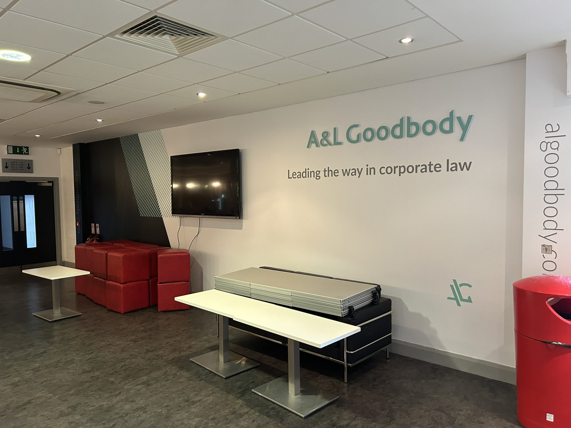 When A&L Goodbody extended their partnership with Ulster Rugby, they set out to refresh the stadium lounge with a stronger visual identity—something that would feel premium, cohesive, and instantly reflective of their brand presence.